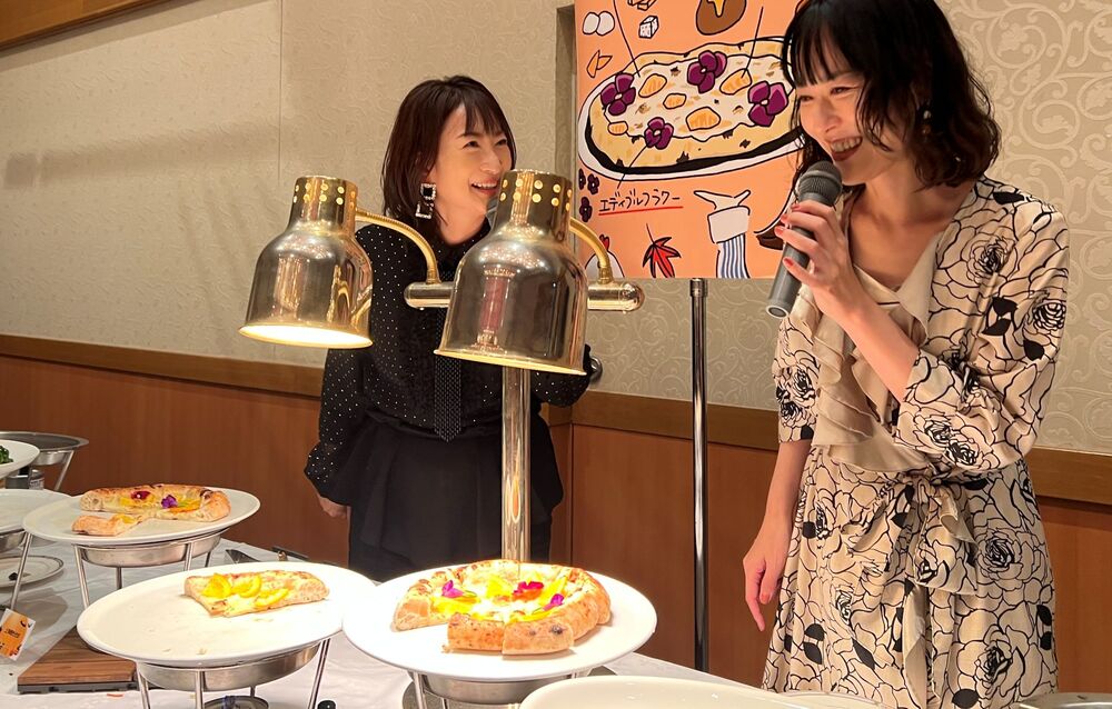 珠久さん提案のピッツア「グラッツェ クアトロ・フォルマッジ(はちみつ添え)」と、藤原さんの「和風スープパスタ」が披露され、田中光料理長の紹介とともに提供されました。