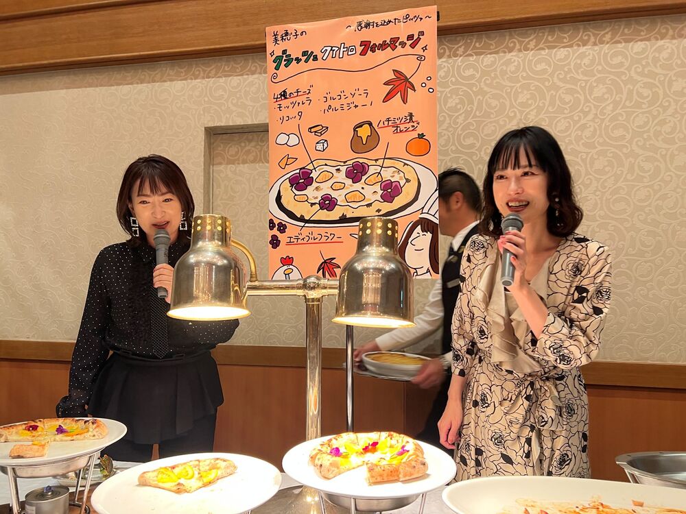 珠久さん提案のピッツア「グラッツェ クアトロ・フォルマッジ(はちみつ添え)」と、藤原さんの「和風スープパスタ」が披露され、田中光料理長の紹介とともに提供されました。