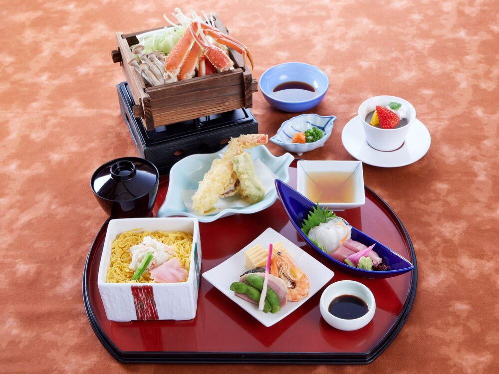 ズワイガニをふっくらと蒸し上げたセイロを主役に、蟹の天ぷらや蟹ちらしなど、冬ならではの味わいを盛り込んだ御膳です。口取りや造りを添え、食事の進みとともに、蟹の旨みをさまざまなかたちで楽しめる構成にしました。