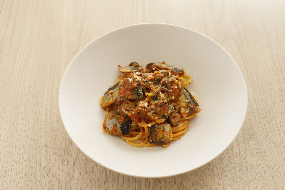 オリーブ、ケッパーなどを使い酸味や塩味が特徴の刺激的なトマトソースのパスタに旬の秋刀魚を合わせました。