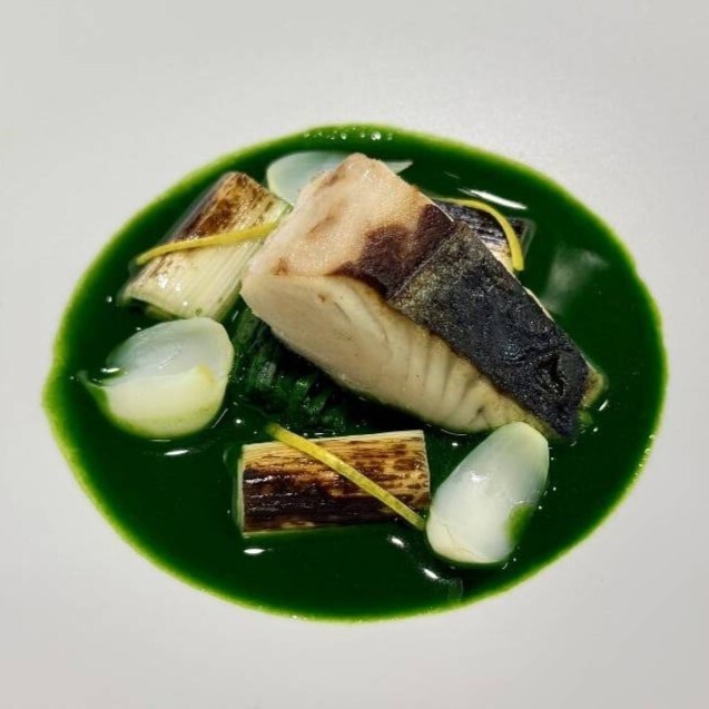 <魚料理> 国産サワラの薪窯焼き 春菊と魚介のソース